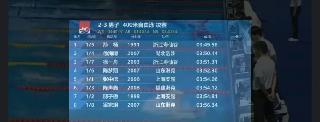 8月25日上午,孙杨在合肥体育中心进行的2024年全国夏季游泳锦标赛男子400米自由泳比赛预赛中,以3分54秒98的成绩位列第2,晋级决赛。这是他禁赛多年后第一次复出亮相正式赛场。