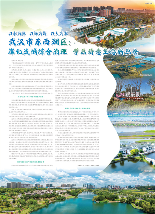 东西湖区,因湖得名,因水定城。兴城必须治水,治水与兴绿同步。“推窗见绿,出门见水,四季见花,人与自然和谐共生”,这是东西湖区坚持共抓长江大保护、不搞大开发原则,加强流域综合治理和统筹经济发展的生动实践。