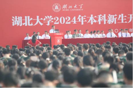 在华中科技大学2024级本科生开学典礼上,来自五湖四海的7189名本科新生齐聚喻家山下,共同唱响《歌唱祖国》。现场,目之所及皆是一片中国红。校长尤政在讲话中提到来自华科大的三名奥运冠军的故事。