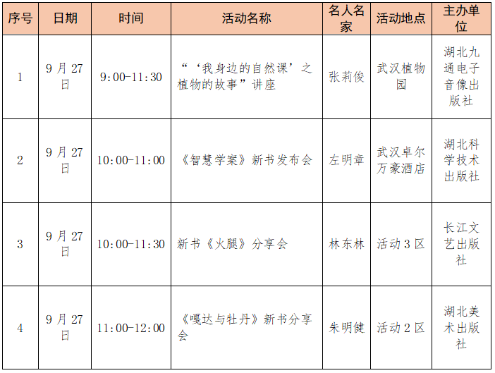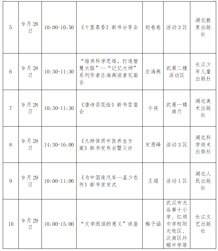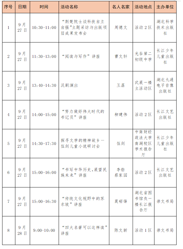 长江出版传媒旗下各参展出版社此次将邀请柳建伟、刘醒龙、徐鲁、李舫等著名作家,六小龄童、敬一丹等畅销书作者,莫砺锋、陈文新等著名学者,王汉中、张献龙等荆楚院士和科学家等开展近60场名家讲座与名作分享会、新书发布会、论坛、签约仪式、汉剧演出等活动,与读者共度阅读嘉年华。
