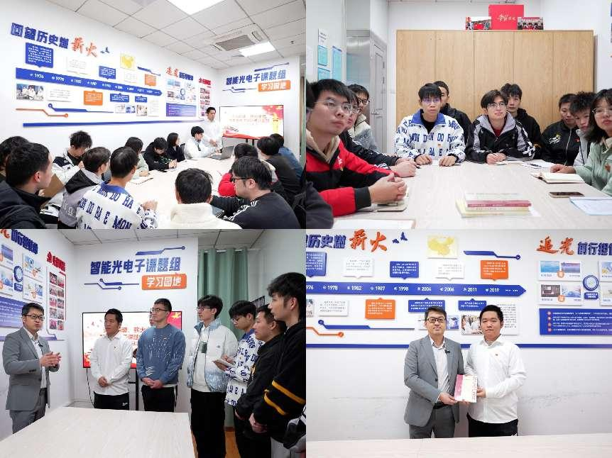 11月18日,支部书记胡临风在鉴湖主楼608课题组学习园区主持理论学习活动,深入解读党的二十大和二十届二中、三中全会关于教育科技人才工作的重要部署。活动邀请李政颖教授讲授“回顾光纤发展史,追光铸魂育新人”的专题知识,李教授描绘了光纤技术的发展历程,并指引了党支部的未来发展方向——党建与科研同向同行,让党支部的堡垒作用和党员的先锋模范作用在科研一线充分发挥。李教授还向支部赠予《我是共产党员——科学报国带头人》等书籍,鼓励党员们投身科研一线,矢志奋斗报国。