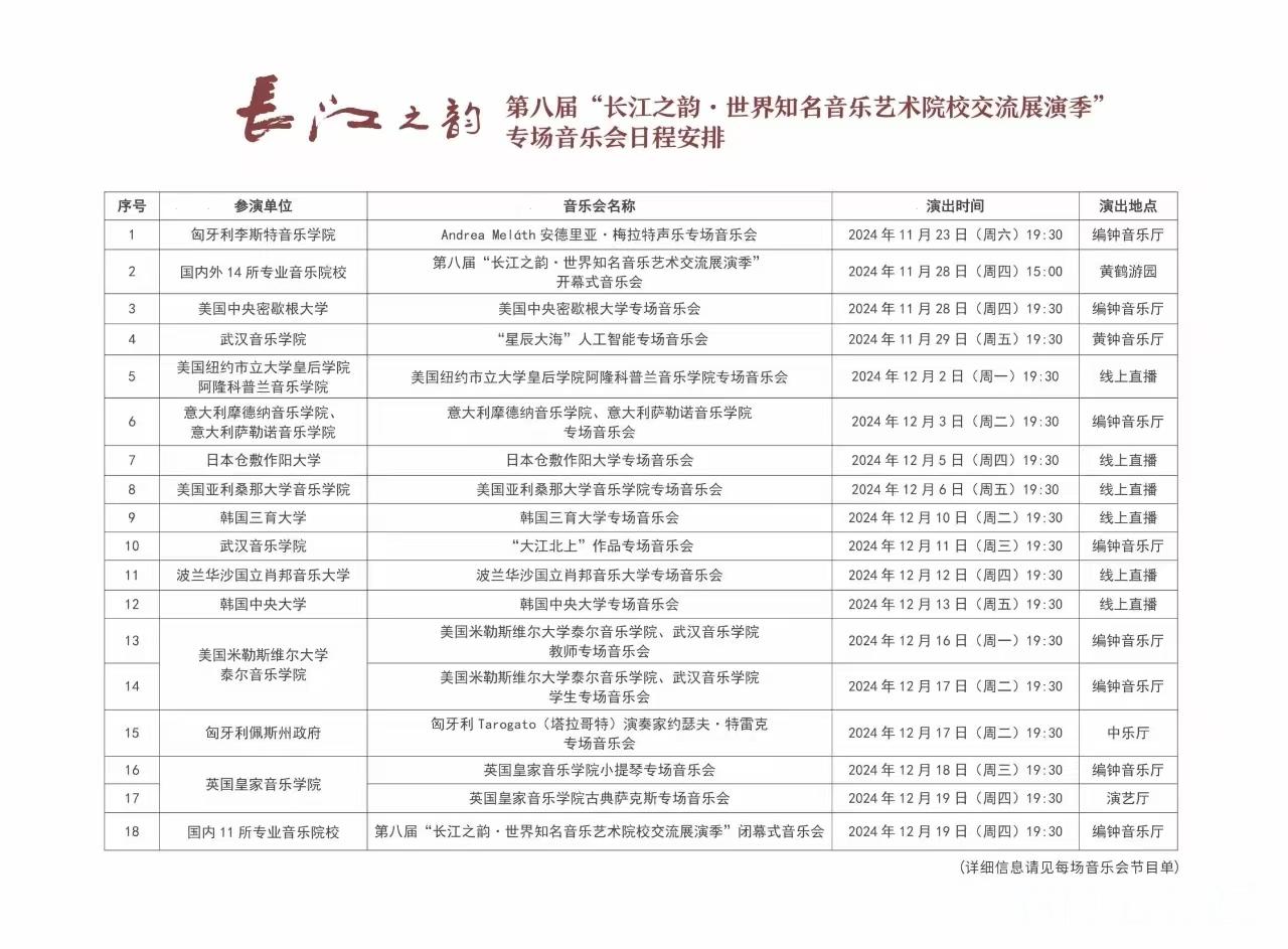 武汉音乐学院相关负责人介绍,本届交流展演季将持续一个月,来自10个国家26所世界知名音乐艺术院校和乐团齐聚长江之畔,为观众奉献18场高水平音乐会,20场专业公开课、学术讲座和音乐工作坊。