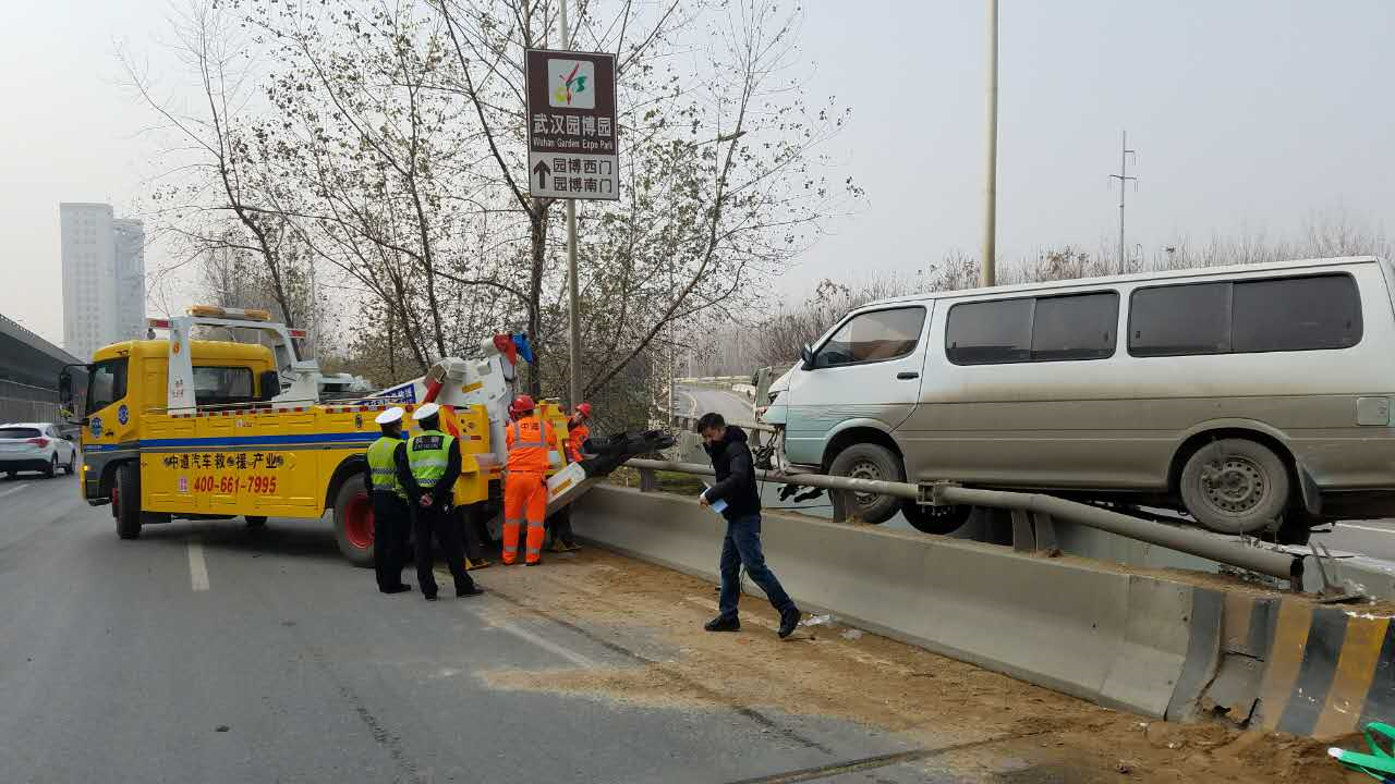 长江云报道(记者马丽 通讯员董冠男)2017年元月2日上午10时许,江汉区交通大队指挥室民警在视频巡查中发现,三环线常青路立交至古田二路方向有一辆面包车骑在金南一路匝道口的护栏上,车身一半悬在护栏外,一半悬在护栏内,随时有可能坠入桥下。见此情况,指挥室立即调派民警和救援车辆赶到现场进行处置。