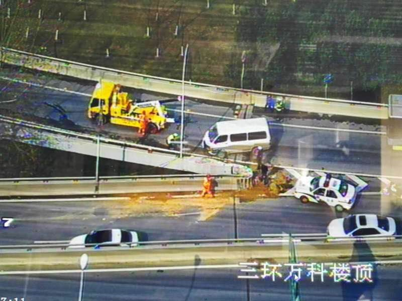 事故处理中队民警娄波、熊行峰到达现场后,发现面包车已将匝道口分道隔离墩撞得粉碎,隔离墩内的黄沙洒了一地,驾驶员已经从车上爬了出来,因为受到了惊吓和轻伤,坐在地上正在休息。民警立即将驾驶员扶上警车,并指挥救援车进行施救。