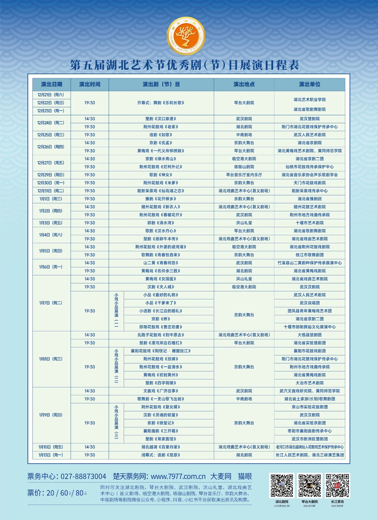 12月22日至1月13日,第五届湖北艺术节将上演包括28台剧目、30个演出场次在内的“优秀剧目展演”,囊括15台小戏小品的3场“小戏小品集中展演”,群英荟萃、好戏连台,敬请期待!