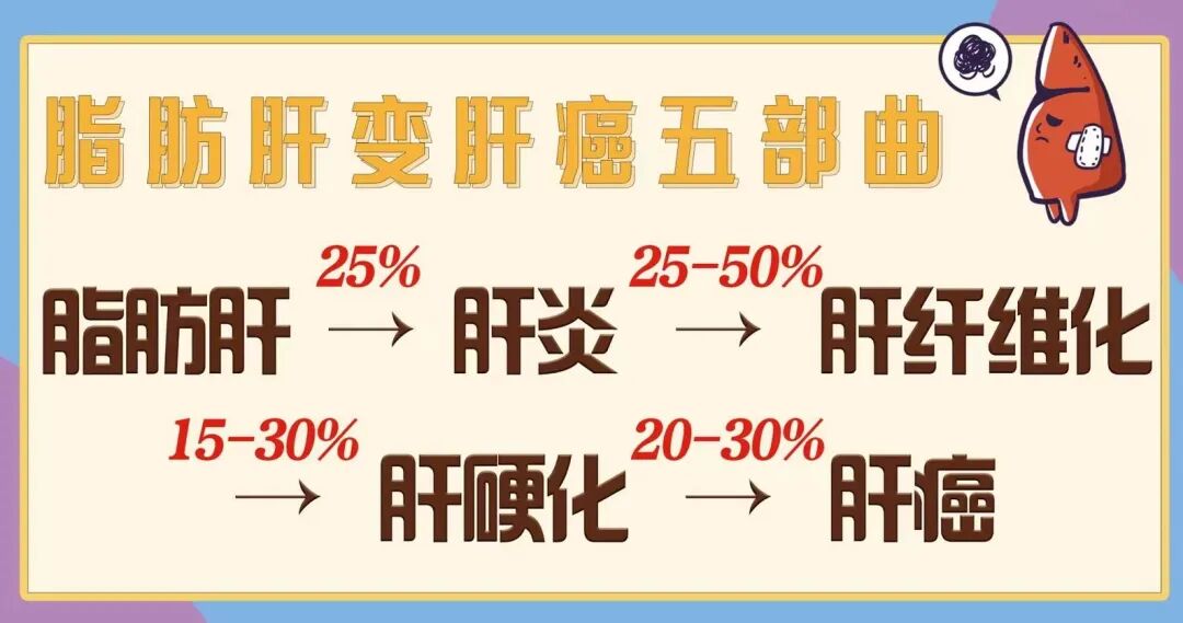 约25%的单纯性脂肪肝可导致脂肪性肝炎,25-50%的脂肪性肝炎可导致肝纤维化,15-30%肝纤维化可导致肝硬化,20-30%脂肪性肝硬化可进展为肝癌。《中国脂肪肝治疗指南》显示,我国成人患肝癌率高达12.5%~35.4%,平均每三个成年人当中就有一名脂肪肝患者。脂肪肝已经成为中国第一大肝病,我们一定要重视!