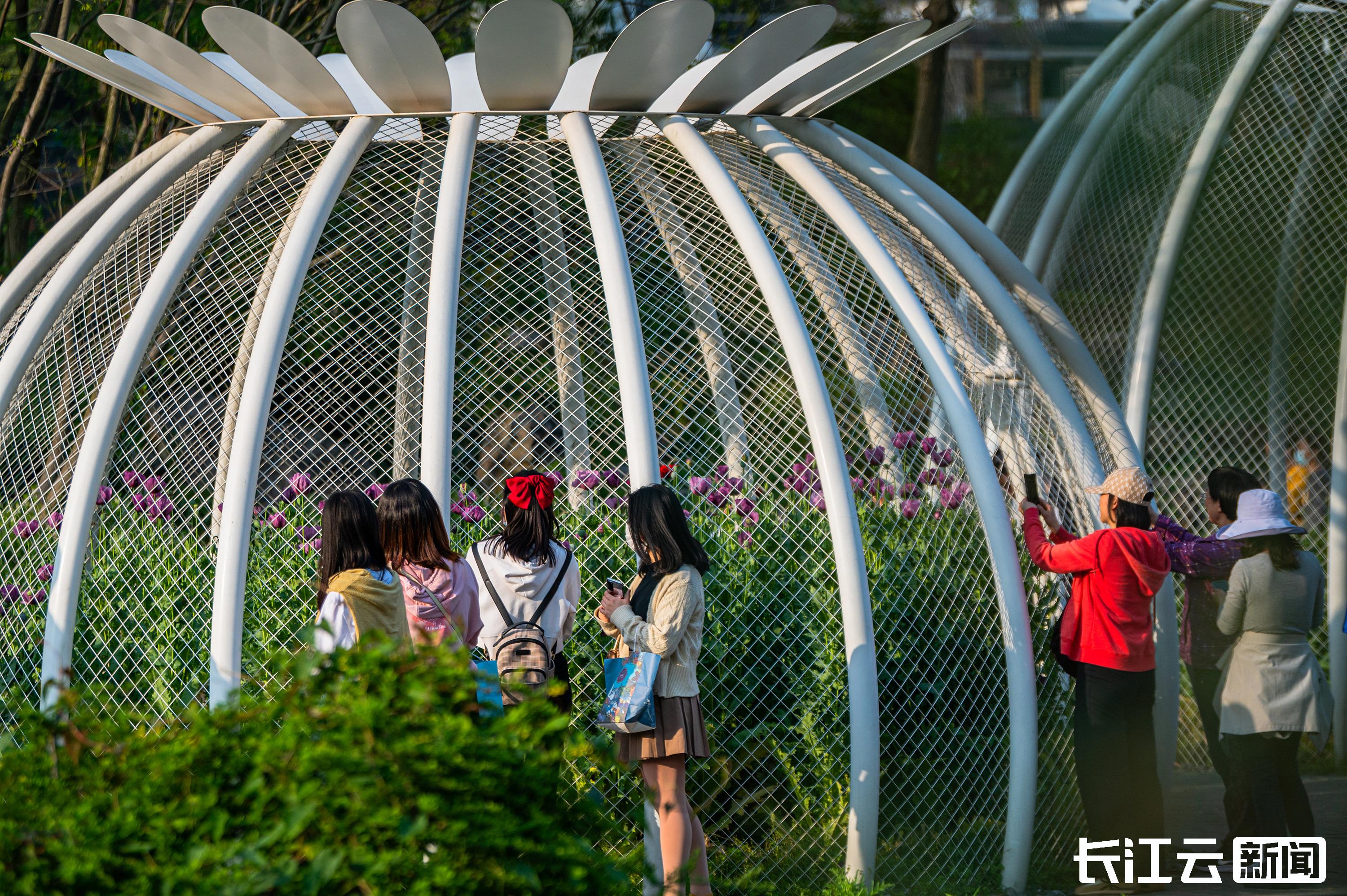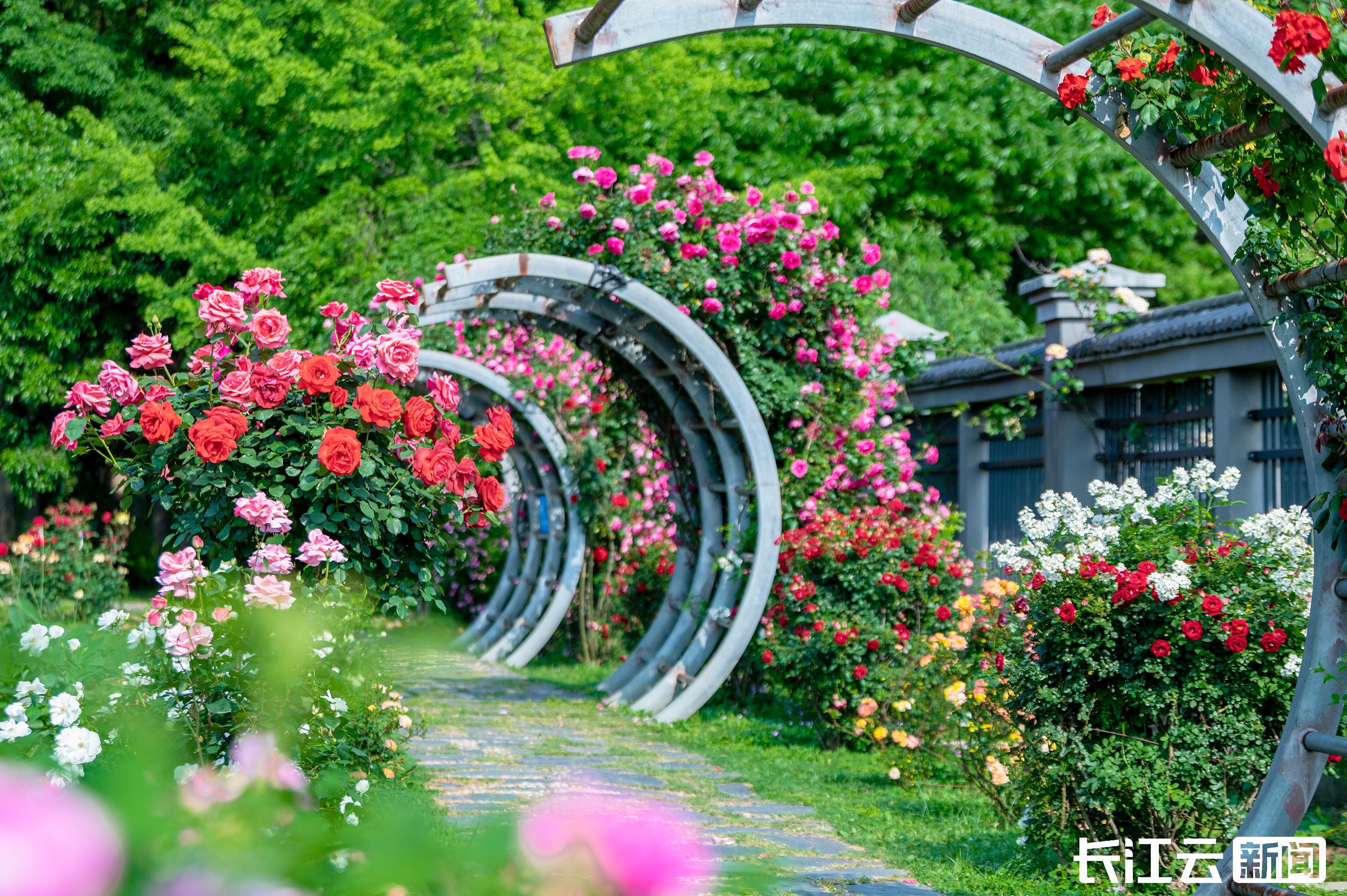 七千株月季在春日尾声掀起最炽热的乐章。“粉扇”的绯红、“黑珍珠”的神秘、“绿星”的清新,两百个品种的月季以九重色谱编织视觉交响。当藤本月季攀上廊架,树状月季摇曳生姿,一场色彩流动的盛宴,将浪漫铭刻在江城。满目繁花,随手一拍就是元气清新大片。