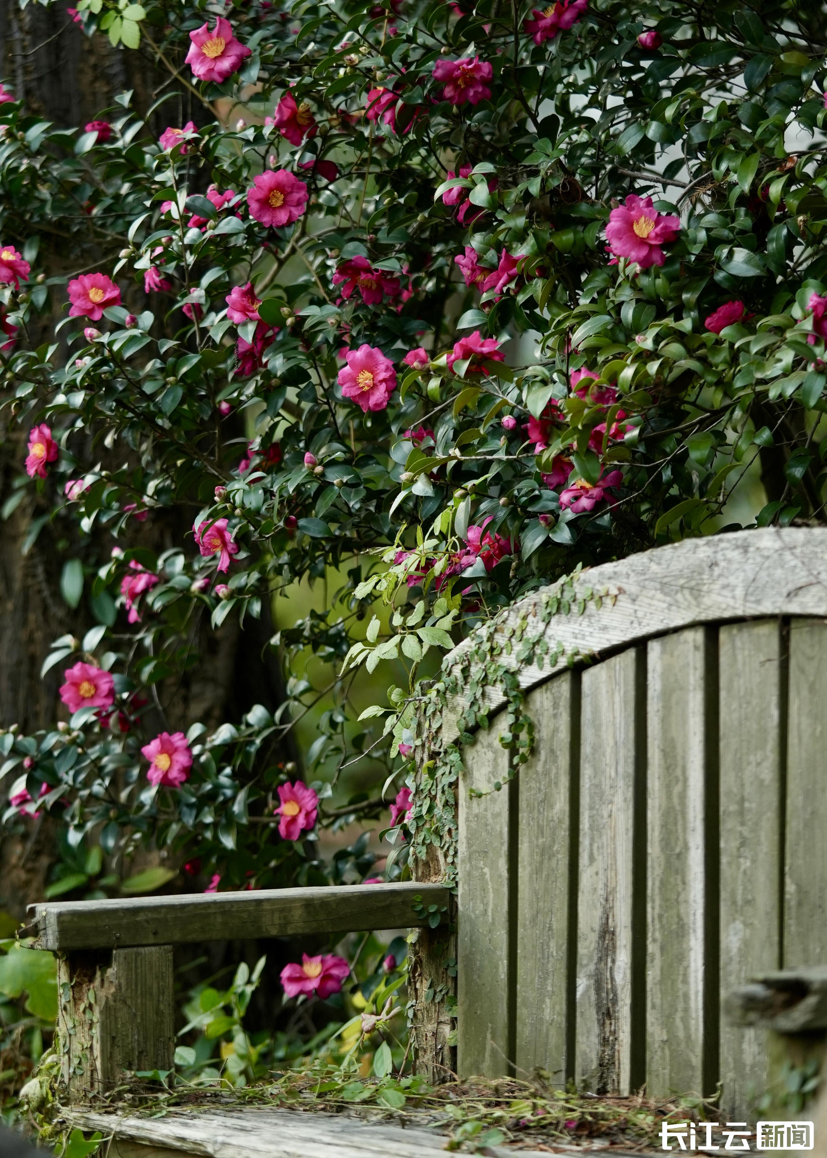 山茶园汇聚国内外名品山茶,有我国古老品种“十八学士”,世界名品“贝拉大玫瑰”、花香浓郁的“烈香”、叶似鱼尾的“鱼尾茶”,还有茶梅品种十余种。山茶优雅俏丽,茶梅红火热烈,一树繁花自成风景。在山茶园,以林、亭、桥、溪为背景拍摄茶梅山茶都很出片。