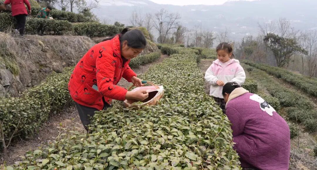 3月8日,记者在峡口镇岩岭村茶园看到,一行行茶垄青翠欲滴,一茬茬绿茶抽出新芽,嫩绿的新芽在阳光照耀下格外醒目,散发阵阵清香。茶农们穿梭在茶树间,将鲜嫩的芽头采摘入篓,个个脸上洋溢着丰收的喜悦,欢声笑语回荡在青山绿水间。