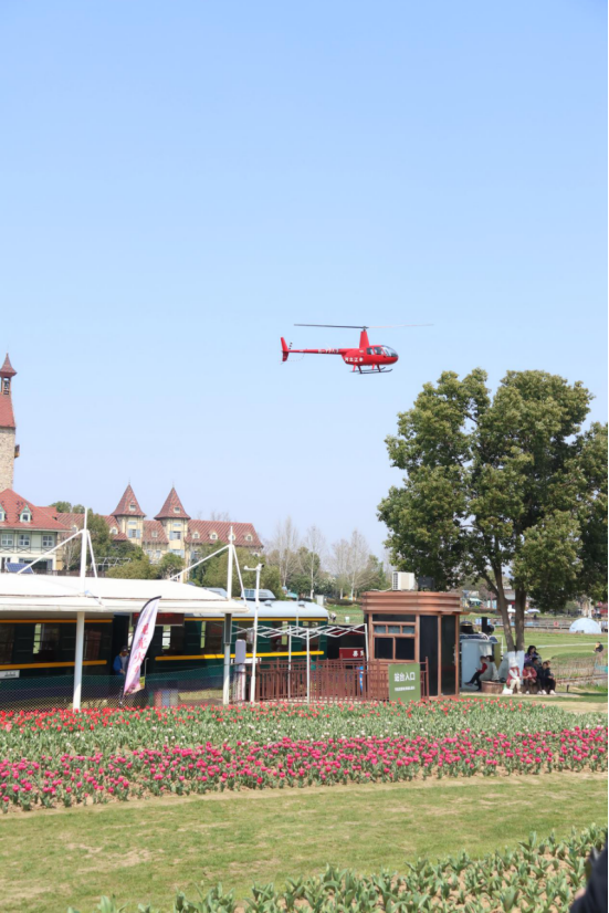 随着螺旋桨的轰鸣声,一架直升机盘旋升空,乘载着游客“飞阅春天赏花海”。迎着三月的春风,千亩花海绚烂绽放,如云似霞;喷泉倒映春日美景,水光潋滟间,花影摇曳生姿;观光火车在繁花簇拥中,于法式文旅小镇穿梭而过;花田间、步道上,随处可见正在拍照打卡的游客,自然和田园相映成趣的美丽画卷尽收眼底。