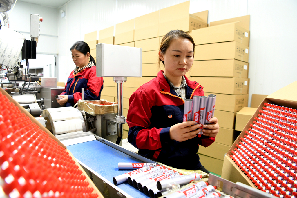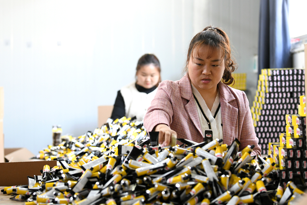 2025年3月25日,在湖北省咸宁市通城县关刀镇工业园丰德伟业新型材料公司,员工在加工、包装出口胶产品。