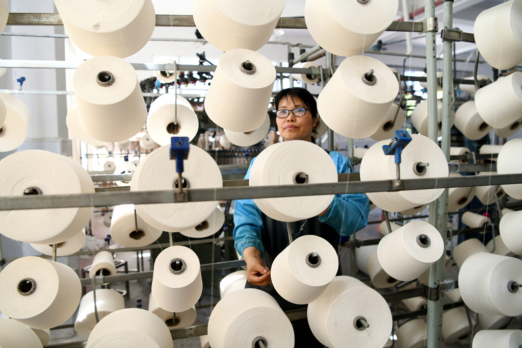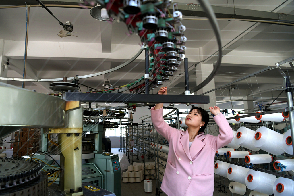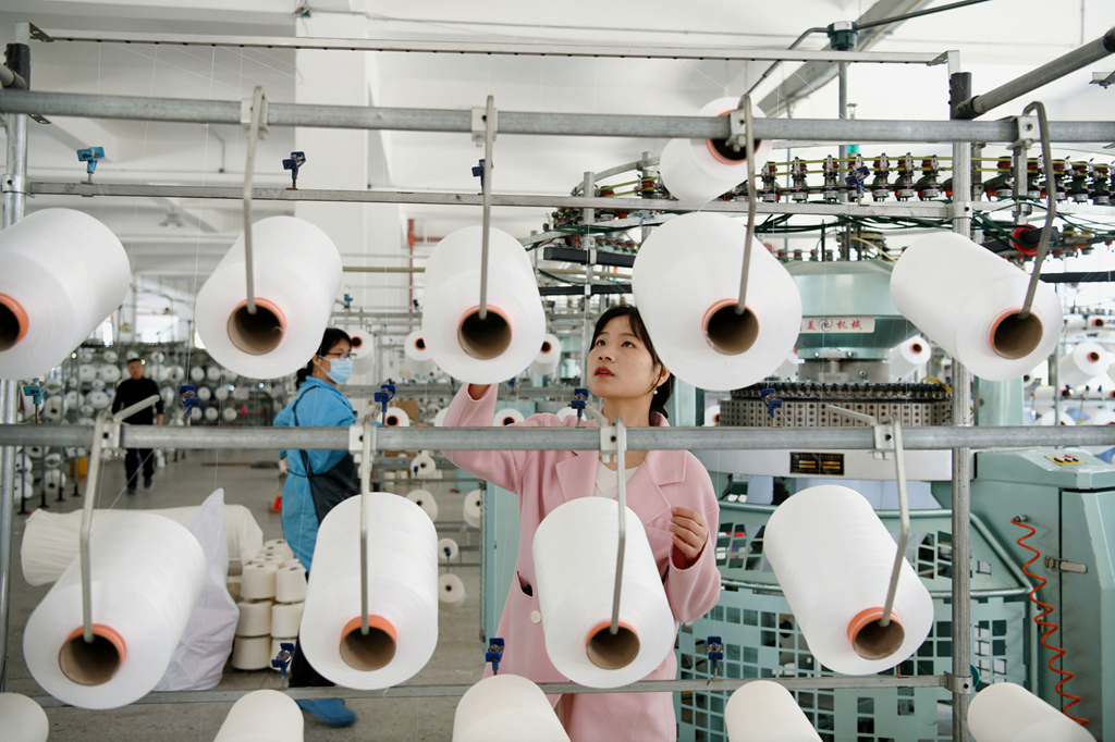 2025年3月25日,在湖北省咸宁市通城县关刀镇关刀工业园盛诚纺织车间,员工在纺布。