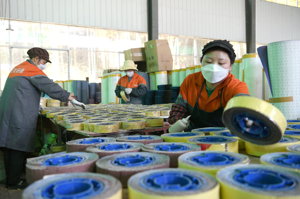 2025年3月25日,在湖北省咸宁市通城县关刀镇工业园研磨新材料车间,员工在加工生产磨具。
