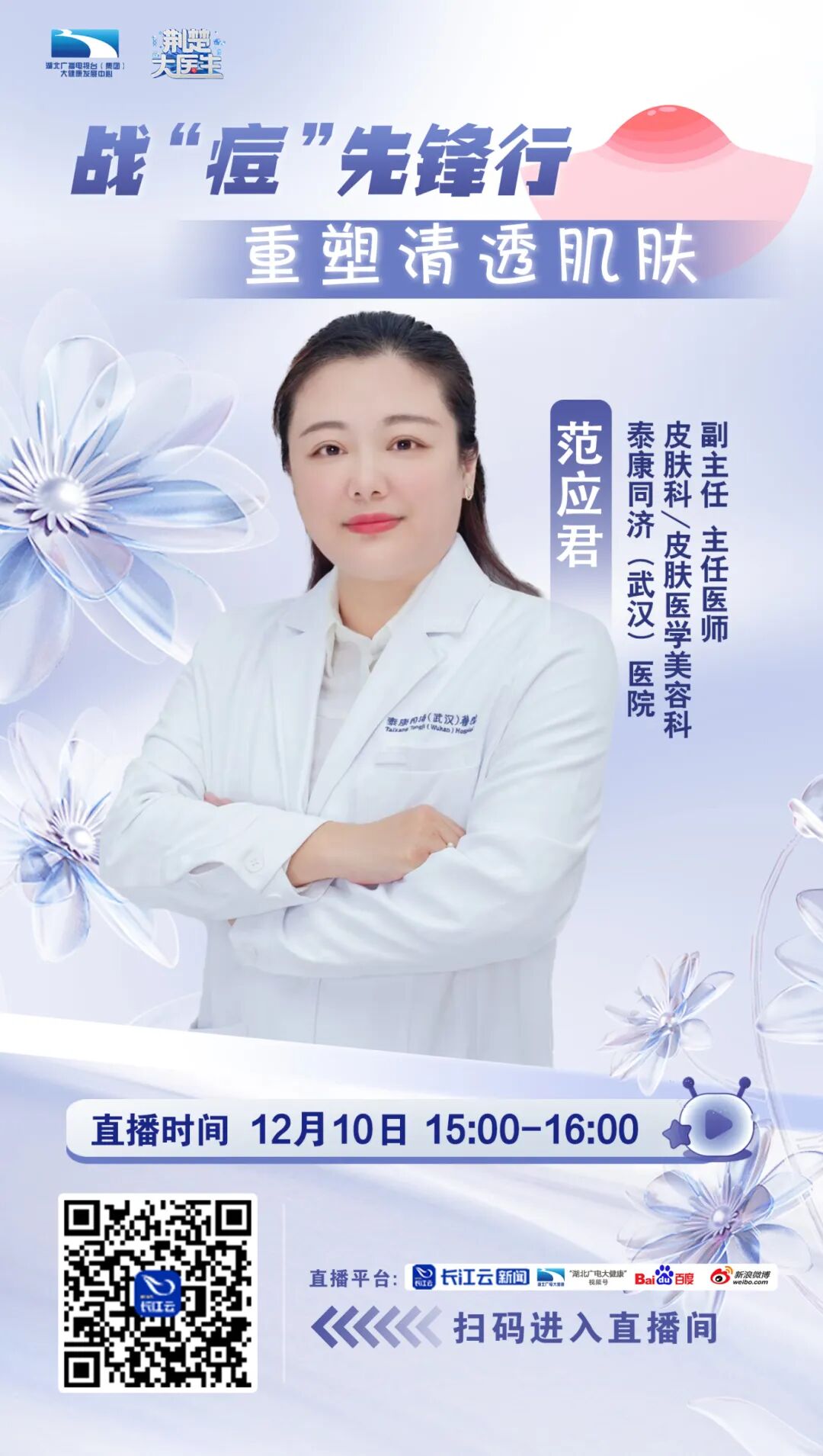 泰康同济(武汉)医院和湖北广电大健康发展中心联合策划的特别直播,邀请到了泰康同济(武汉)医院皮肤科/皮肤医学美容科副主任、主任医师范应君,来和大家好好说说祛痘这件事。