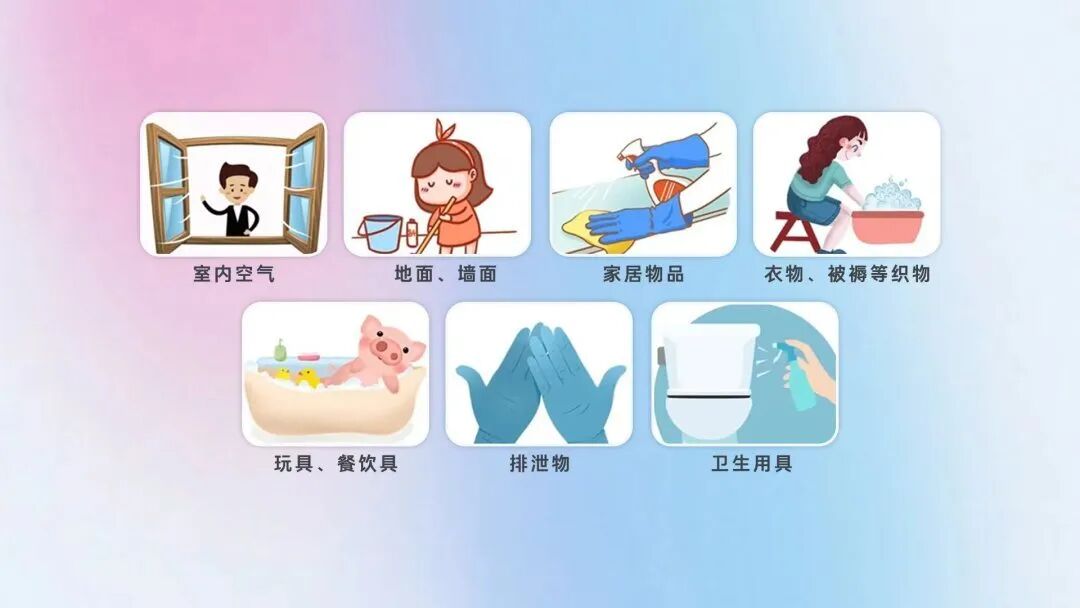5玩具、餐饮具:用消毒水对玩具进行擦拭(浸泡)消毒。等10-30分钟后,再使用清水擦拭、冲洗去除消毒剂残留;餐饮具、奶瓶等耐热物品可煮沸后维持15分钟以上。