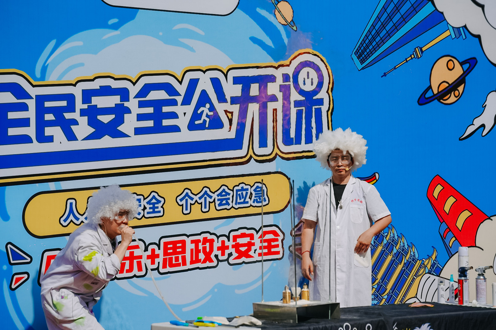 活动现场,华师一附中初中部操场被划分为多个实景体验区,包括主舞台区、实验展示区、交通安全模拟区、应急技能体验区等,成为了一本“行走的安全教科书”。在实验展示区,华中师大一附中初中部的化学老师金梦煜通过“火山喷发”“粉尘爆炸”等趣味实验,生动揭示生活中的安全隐患;武汉蓝天救援队则以情景剧形式还原溺水救援场景,传授自救互救技能。