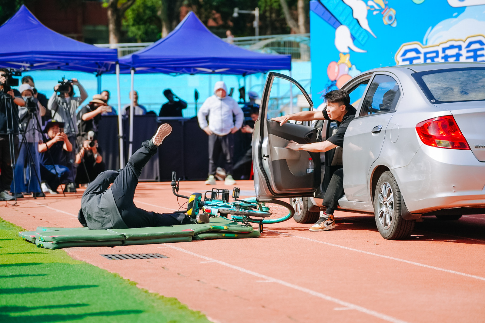 交通安全模拟区尤为引人注目。东湖高新交警大队通过警示教育短片、骑警队手势操表演以及模拟交通事故场景,让学生们深刻认识到遵守交规的重要性。特技演员现场演绎“鬼探头”“开门杀”等危险场景,配合交警的专业讲解,让安全知识深入人心。一名参与体验的学生感慨:“原来危险就在身边,安全无小事!”