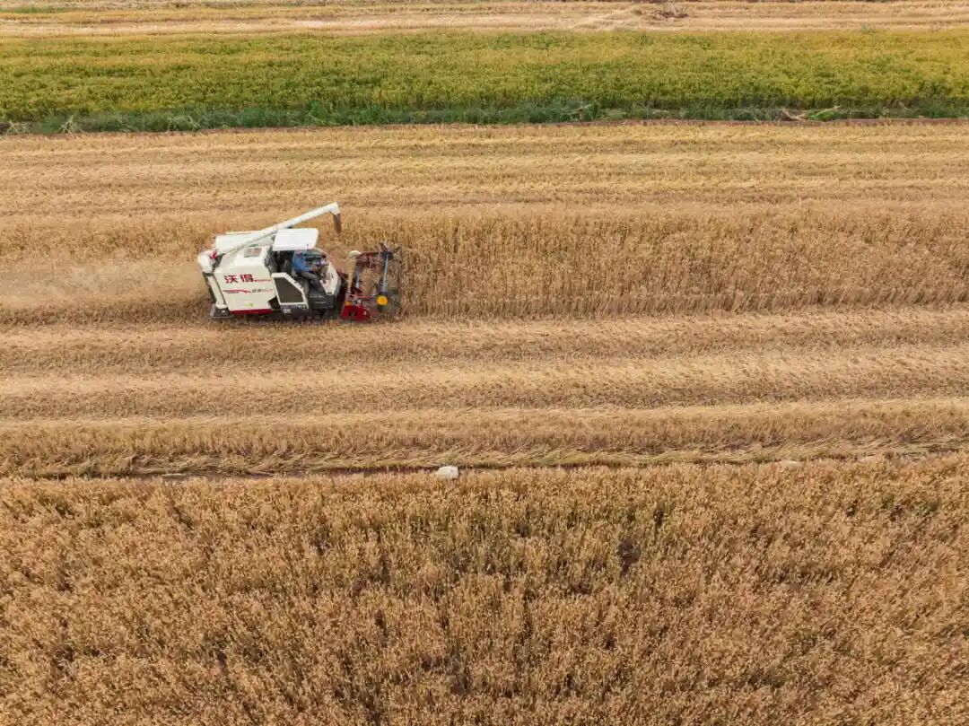 在马桥镇中坪村,麦浪翻涌,饱满的穗头铺满麦田,浓郁的麦香弥漫田野。联合收割机在滚滚麦浪中往来穿梭,金灿灿的麦浪与轰隆隆的机声奏响丰收号角,麦粒从收割机中“喷涌”而出,一派丰收景象。