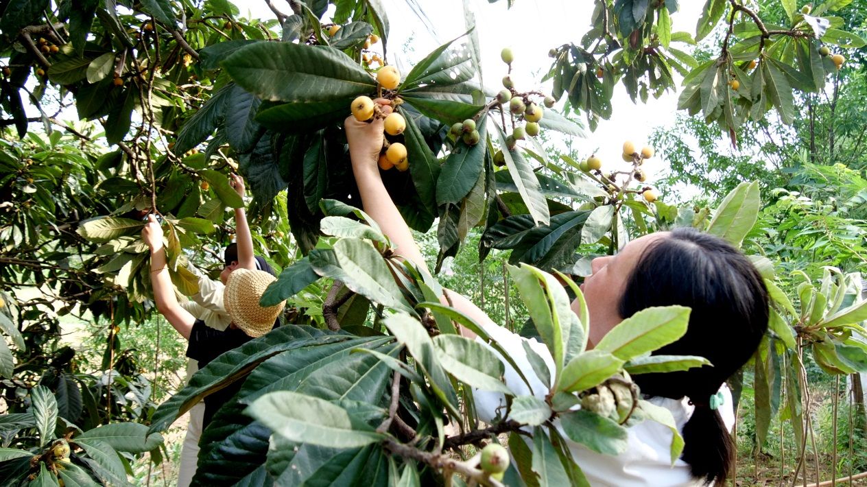初夏时节,湖北襄阳南漳县九集镇尤岗村魏三家庭农场的百亩枇杷园迎来丰收季。金黄的枇杷挂满枝头,果香四溢,吸引了众多游客前来采摘品尝。