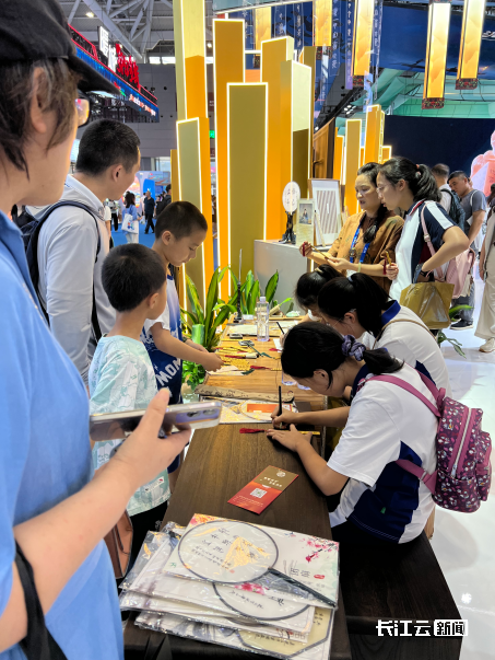 湖北馆以“简牍文化”为核心亮点。“最早的家书”独具吸引力,展会期间,连续五天众多参观者慕名而来。尤其是深圳市中小学生们,在老师和家长的带领下,非遗传承人黄有志通过详细讲解介绍,让师生和家长们全面了解湖北云梦睡虎地秦简、荆门郭店楚简、荆州张家山汉简等历史、字体构成等。大家亲自动手复刻竹简、木牍,沉浸式体验汉字和荆楚文化的魅力。