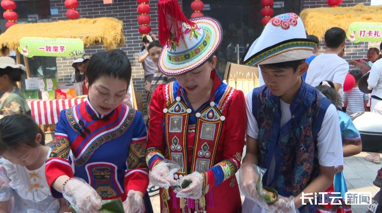 清江古城内,多民族群众身着绚丽的民族服饰,欢聚一堂,共同包粽子、做香囊,感受着传统民族文化的独特魅力。裕固族群众强子芮说:“各民族同胞一起包粽子、做香包,意义非凡。我们用不同的方式,共同唱响这首思念的歌,传承民族文化。”土家族群众何凤琴则以粽子为喻,表达了对民族团结的深刻理解:“有好吃的粽子,有好看的西兰卡普粽子,绳子一系就是一个结实的三角粽,象征着我们56个民族团结在一起,再大的风浪也不怕。”