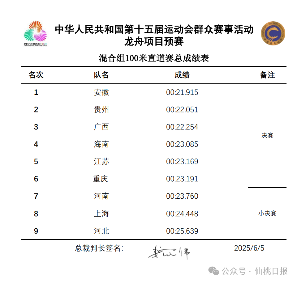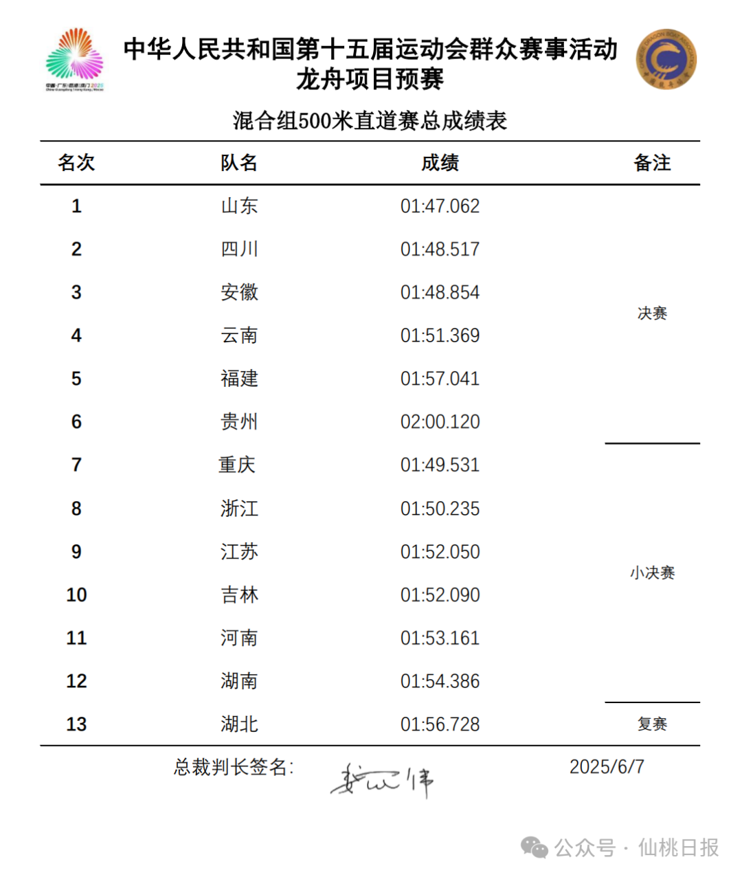 第十五届全运会群众比赛龙舟项目预赛500米直道赛分为女子组(12人龙舟)、男子组(22人龙舟)、混合组(22人龙舟)三个组别,分别进行了预赛、复赛、半决赛、小决赛、决赛,赛事前八名将获得进入全运会决赛阶段的入场券。