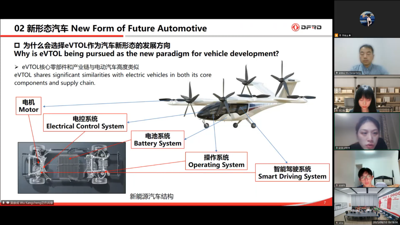 9月10日-9月11日,中法“Z世代”青年们已经通过线上先导课建立起了联系。根据“Z世代”青年们的报名意愿,将成员们分为科技组和艺术组。针对科技组成员,主办方特邀东风汽车研发总院先行技术与材料研究中心氢元室经理吴康成博士,为两国青年深入讲解“未来全域汽车新形态—飞行汽车”,揭秘未来出行领域的创新方向。