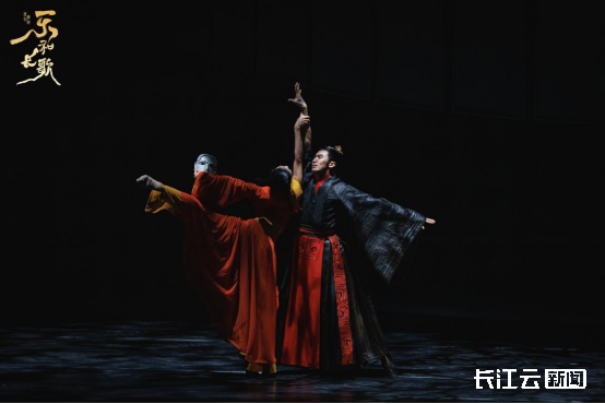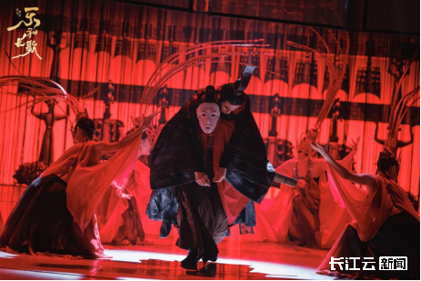 舞剧在舞蹈语汇上极力还原楚地风貌。女子群舞中“翘袖折腰”的柔美灵动,男子战舞中的刚劲雄浑,巫舞与傩戏中神秘原始的仪式感,共同构建出一个瑰丽而充满张力的古楚世界。凤鸟、双头鸟等图腾符号频繁出现,既是对楚人泛神信仰与生命哲学的视觉化呈现,也暗合角色内心的情感流动与命运走向。