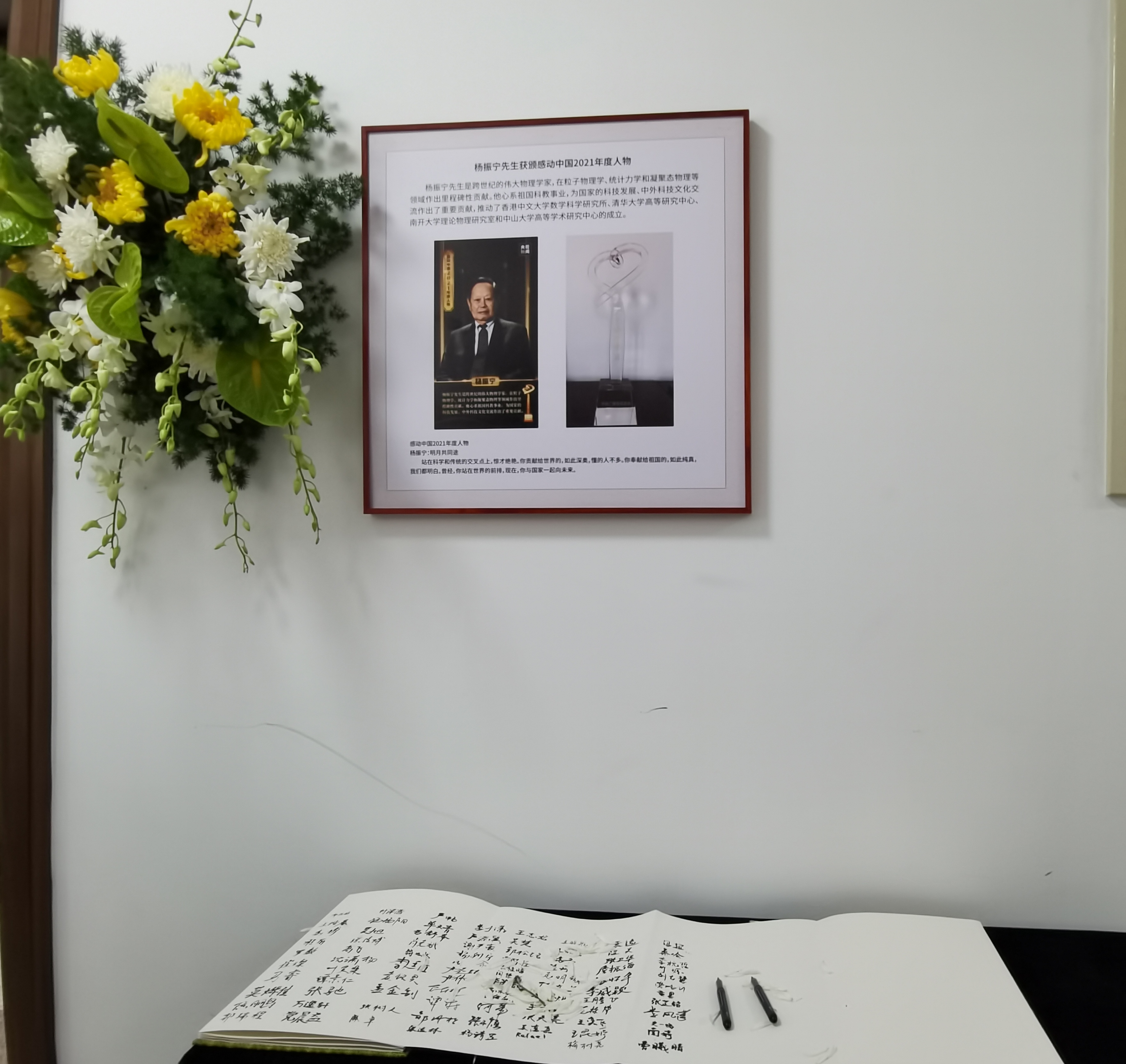 为深切缅怀杨振宁先生,清华大学高等研究院在科学馆一楼119房间设立杨振宁先生缅怀室,于2025年10月18-24日期间,接受校内师生及社会相关人士吊唁。缅怀室开放时间为每天上午九点到晚上九点。