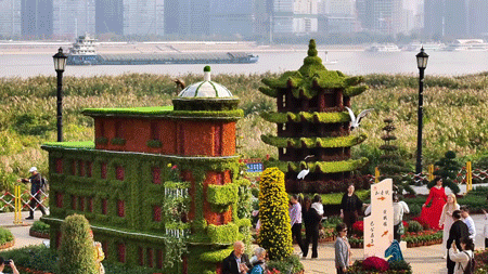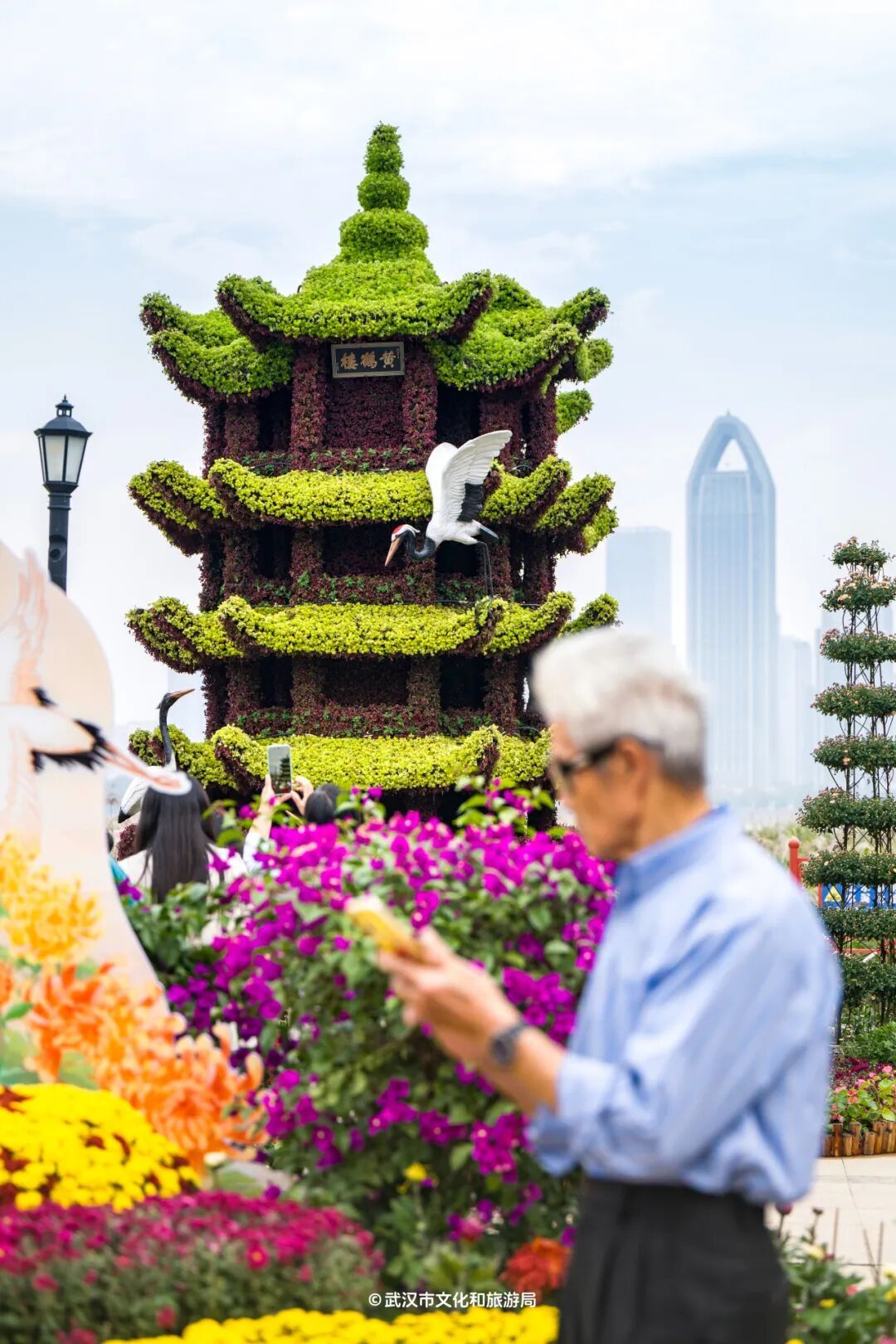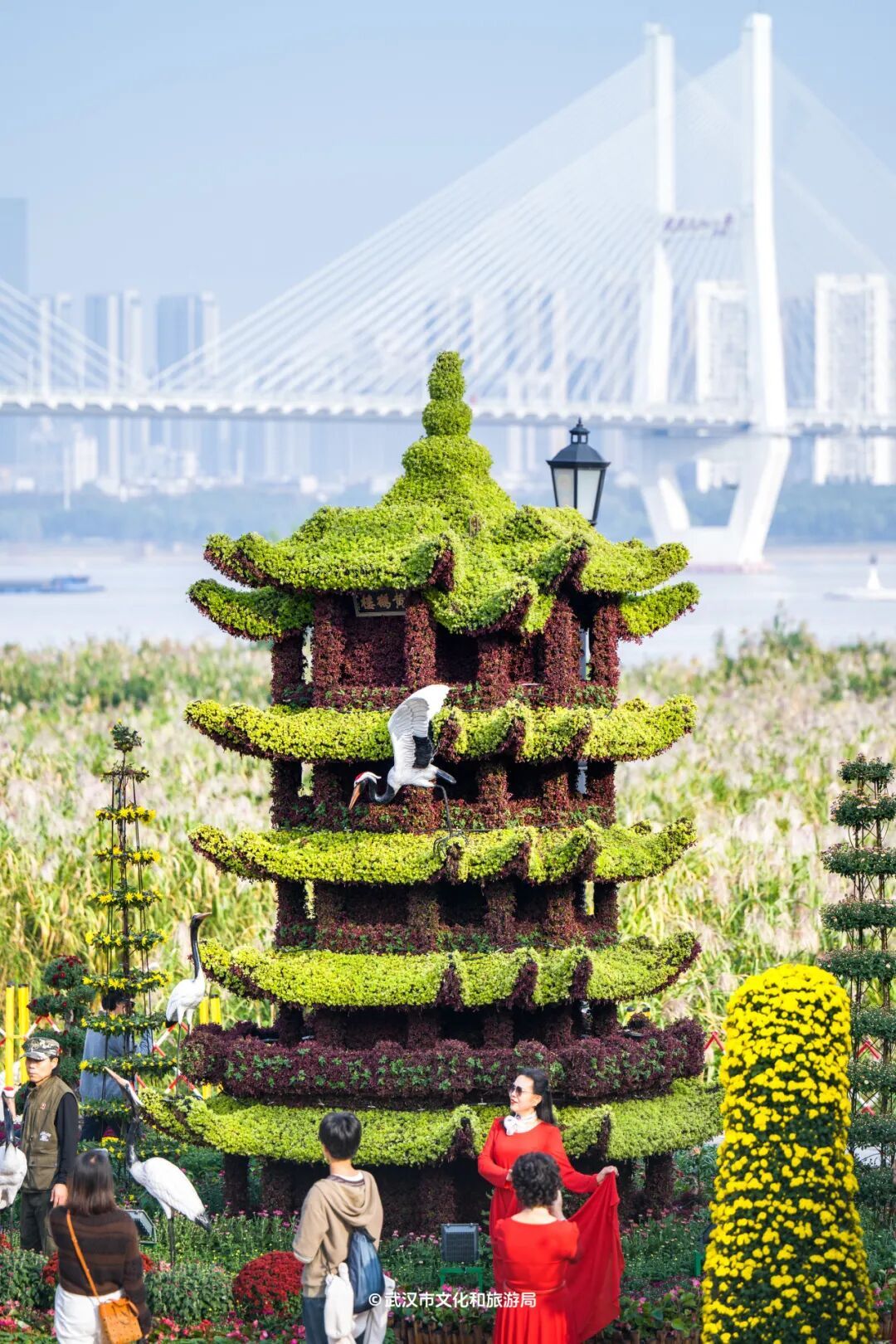 穿过风帆广场,这次菊展最出圈的造景映入眼帘:mini版的黄鹤楼、知音号游轮、巴公房子被毛茸茸的绿植包裹着,伫立长江边。