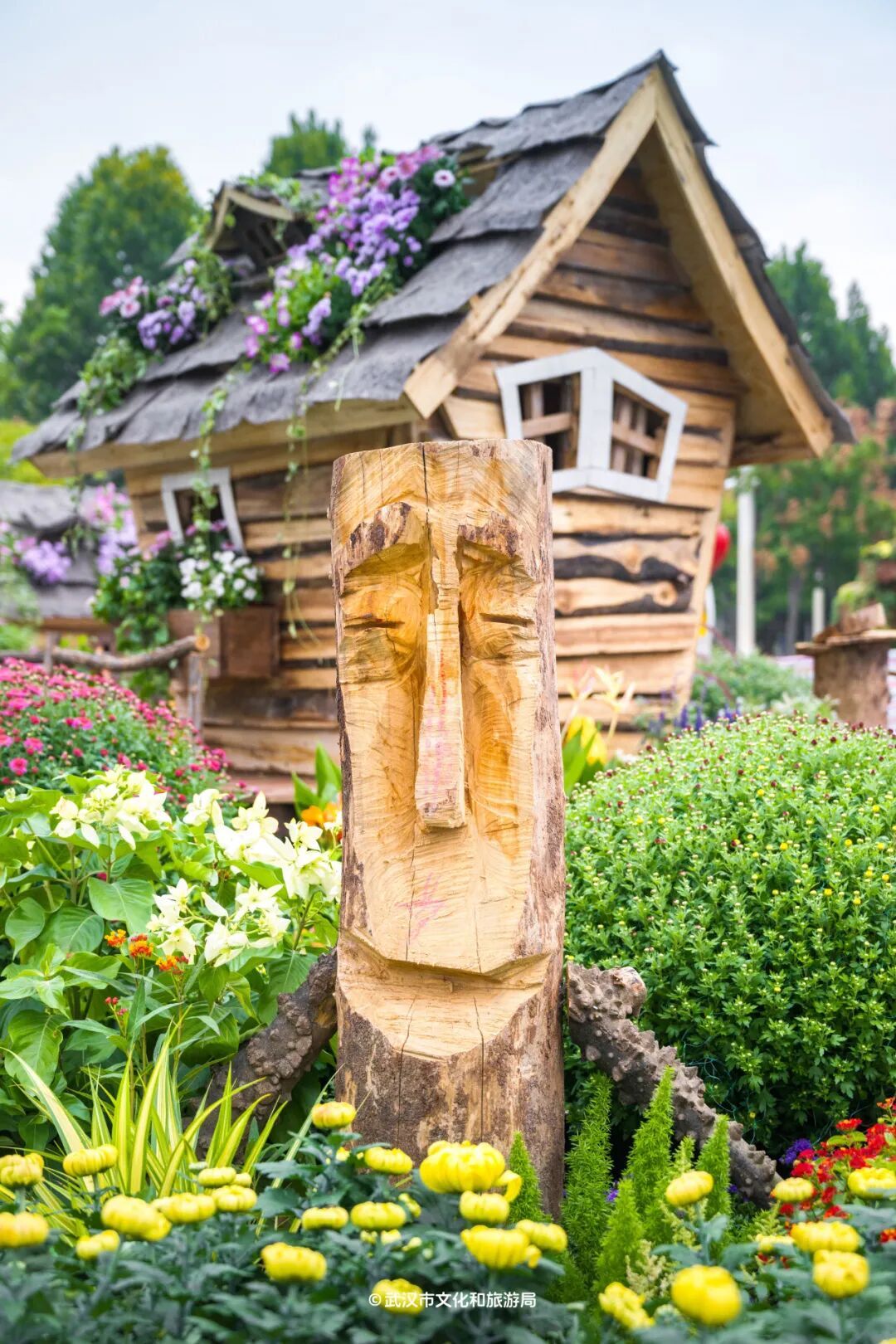 「沙湖公园」的菊展造景,颇有童话意趣。在公园C区大门对面的永久展区,花木点缀出一片梦幻世界:小南瓜拼成可爱木门,树桩雕刻成表情各异的精灵,小鹿造型的草垛戴着花环……