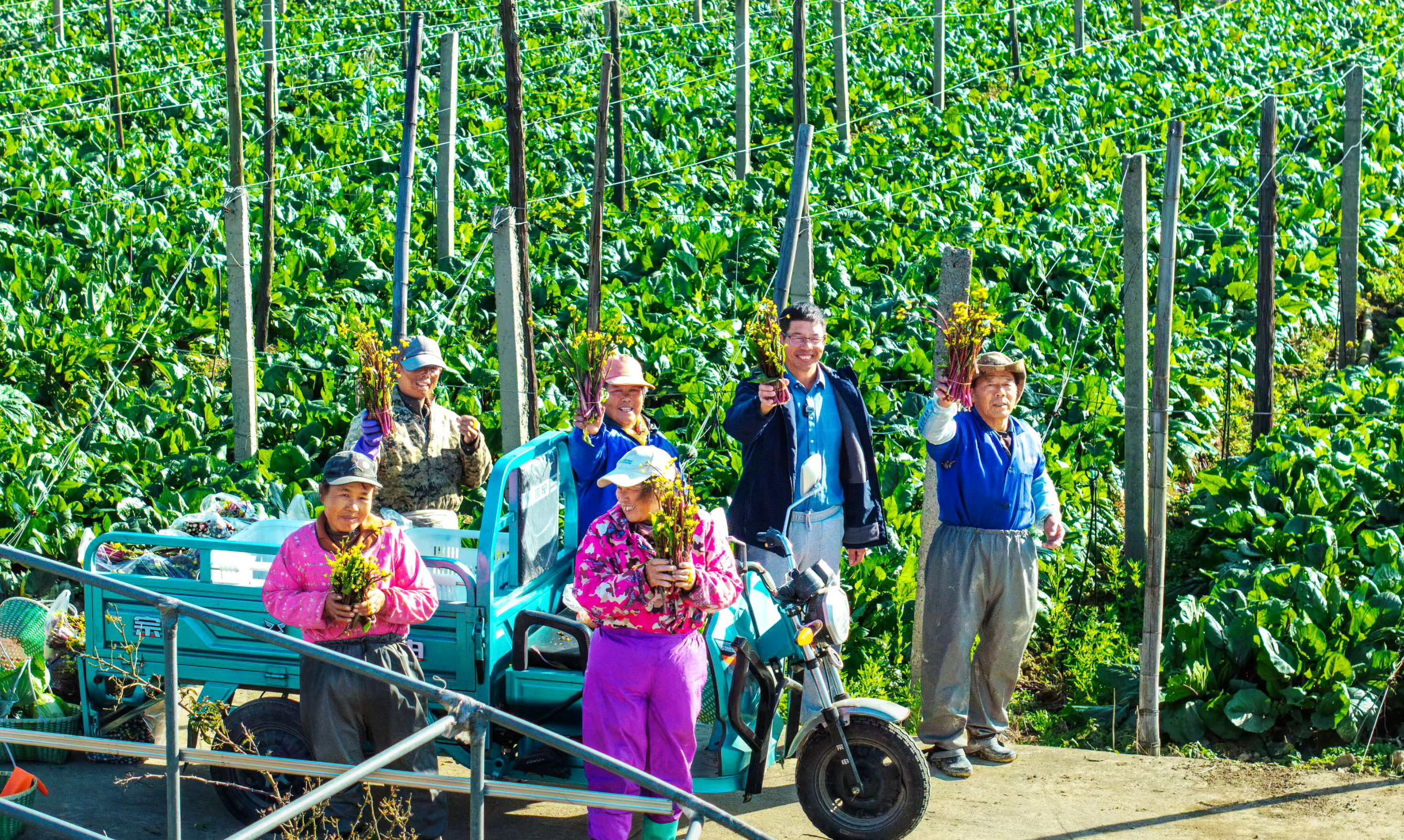产销对接畅通“从田间到餐桌”的绿色通道。阳新县蔬菜产业协会主动牵线搭桥,一方面协调种子、肥料等农资企业精准配送,保障生产资料充足供应;另一方面对接本地商超、农贸市场及电商平台,搭建“线上预订+线下直供”的销售网络,让新鲜蔬菜无需中转即可直达消费者手中。“今年技术指导到位,病虫害少、长势旺,预计亩产超4000斤,而且销路早就对接好了,根本不愁卖。”阳新县蔬菜产业协会会长辛战勇一边带着工人采摘红菜苔,一边满脸喜色地说道。