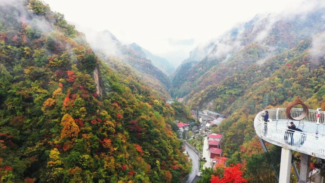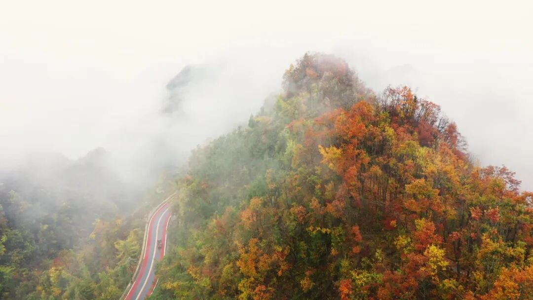 雨后初歇,尧治河村云雾缭绕,白色的云雾从谷底缓缓升起,像轻纱般缠绕在山峦间。金黄的栎树、火红的枫树、墨绿的杉树,被云雾轻轻笼罩,只露出零星的色彩,显得神秘莫测、美不胜收。