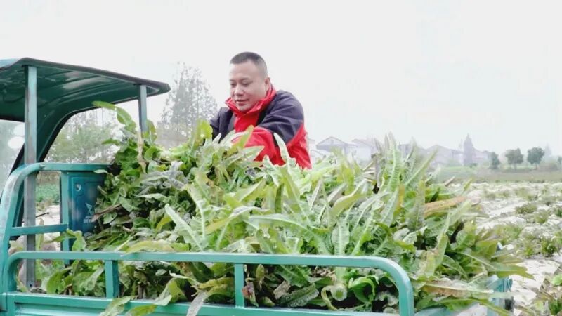 在农场蔬菜基地,村民们正忙着采收露天蔬菜,饱满的白菜、鲜嫩的莴苣、紧实的花菜被整齐装箱,即将送往市场。