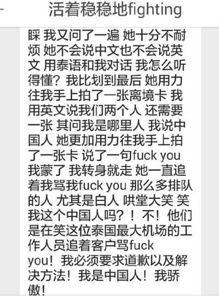 2017年1月6日,凌晨1:40,据中国游客发布微博称,1月5日晚19时,两名中国女游客搭乘CZ8324航班计划从曼谷素万那普国际机场飞回深圳,在填写出境卡过程中,疑遭遇机场工作人员不耐烦后辱骂,并一直追着该游客重复F**K YOU的不雅词汇,据游客称,当时周围还有其他国家的游客,在场时居然大笑。