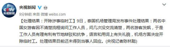 关于两名中国女游客在曼谷机场被工作人员辱骂事件,泰国机场管理局9号在泰国voice TV21发布事件处理结果。根据泰国机场管理局的说法,“两名中国女游客因不清楚流程询问工作人员,问几次没交流清楚,两游客发飙了,于是工作人员进行了有理有利有节的辩驳和抗争,语言和用词上有失礼貌,迫于中国网络舆论的压力,泰方决定开除临时工。”
