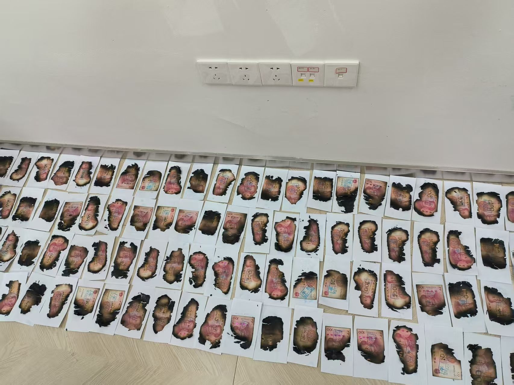 邮储银行黄冈市分行迅速抽调6人成立专班投入鉴别工作,面对炭化粘连纸币,工作人员先用专业现金鉴别仪逐一鉴定纸币防伪特征,确认每张残币的真伪与可兑换比例,加盖“全额兑换”与“半额兑换”专用章,然后耐心细致地用镊子剥离碎片,用专用胶水将破损纸币小心粘贴成型,确保每一片可识别的残角都不被遗漏。经过连续8小时奋战,为客户李大爷最大限度挽回损失,成功兑换现金4.5万元。