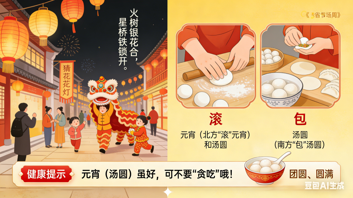 在这一天,赏花灯、猜灯谜、舞龙狮,好不热闹。而作为节日绝对的主角——元宵(北方“滚”元宵)和汤圆(南方“包”汤圆),更是承载着人们对“团圆、圆满”的美好期许。一口咬下去,软糯香甜,是味蕾的极致享受。