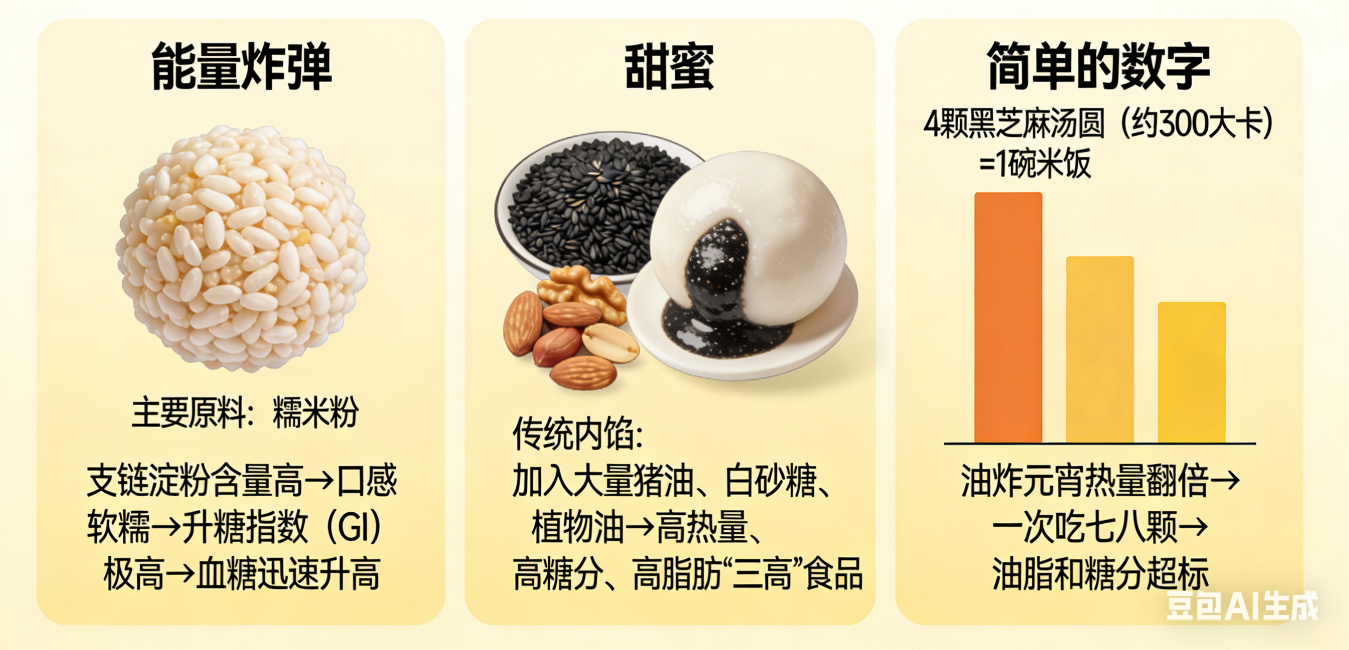简单的数字: 一般来说,4颗常规大小的黑芝麻汤圆,热量就约等于一碗米饭(约300大卡)。如果是油炸元宵,热量更是翻倍。如果一次吃上七八颗,这一整天摄入的油脂和糖分很可能就超标了。
