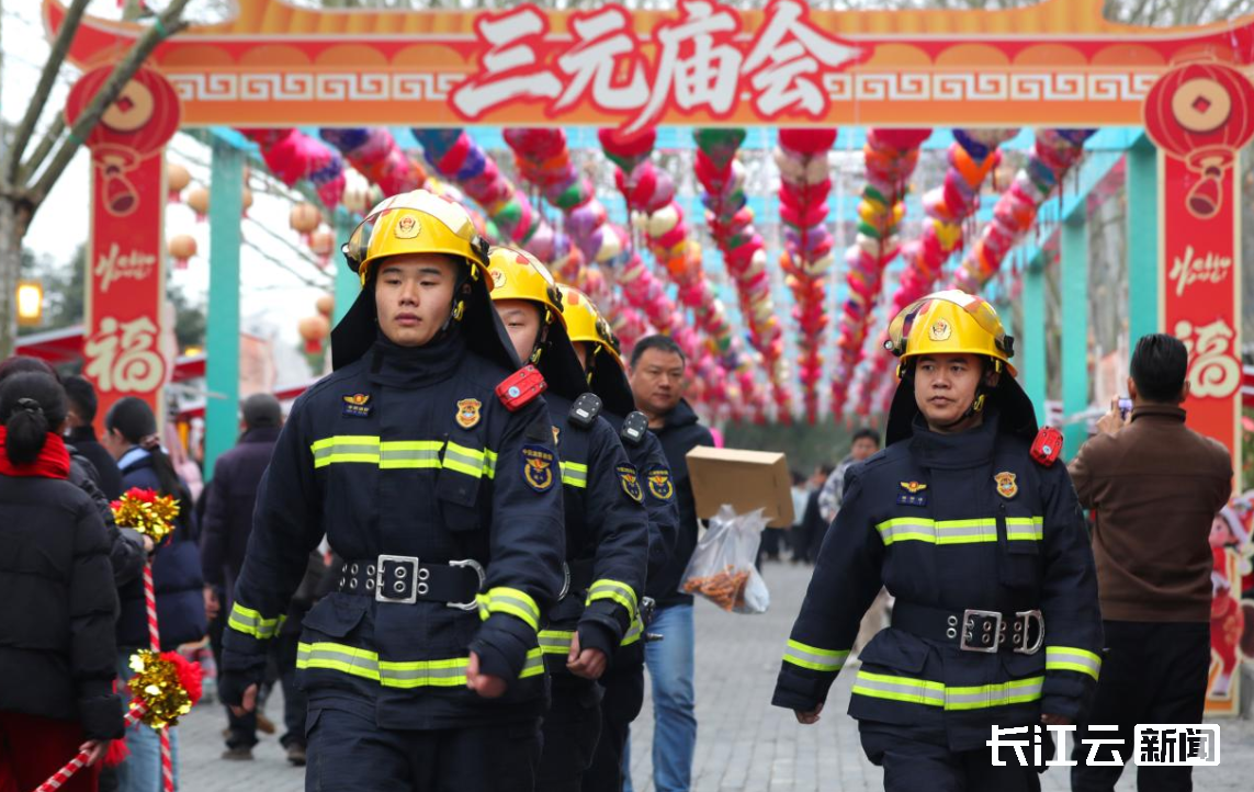 咸宁市消防员在“三元”庙会现场巡逻执勤全天候监护确保场所安全