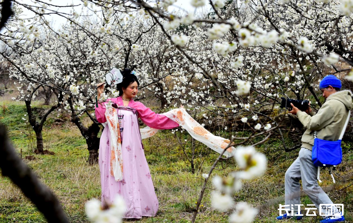 近日,春日暖阳洒落山间。在襄阳南漳县城关镇大山村,万亩樱桃花已悄然绽放。一名身穿汉服的游客徜徉在如云似雪的花海中,轻抚枝头、驻足留影,仿佛从画中走出的仙子,与春色融为一体。