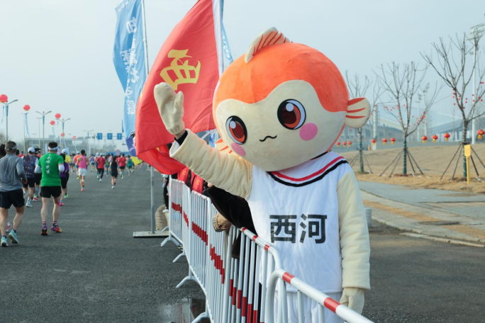 跑道两侧,仙女湖社区和东闸社区的啦啦队使出浑身解数:广场舞阿姨们身着鲜艳服装翩翩起舞,孩子们挥舞自制加油牌齐声呐喊,志愿者的口号一浪高过一浪。人群中,西河镇吉祥物“锦鲤”憨态可掬地扭动身姿,时而摇头摆尾,时而转圈挥手,引来阵阵欢快惊呼。