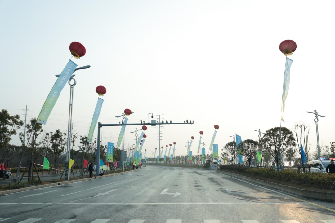 8点12分,大智路与奥体东路路口——这里是孝感马拉松进入孝南段的第一道门户。清晨的红灯笼高挂在行道树间,将天空染成一片暖红。风起时,灯笼穗轻轻摇曳,仿佛在为奔跑者指引方向。