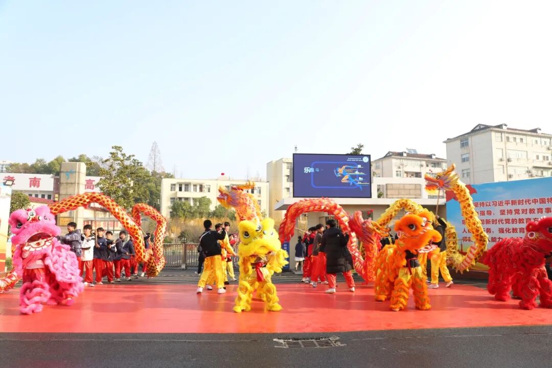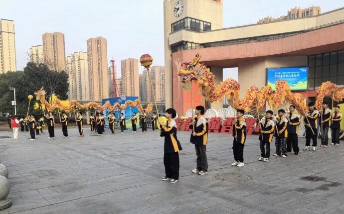 另一边,舞蹈队的同学们踏着欢快的节拍,动作舒展流畅、队形变换有序,灿烂的笑容与灵动的舞姿相映成趣;舞龙队伍更是气势十足,金龙腾跃、辗转回旋,与鼓点呼应、和舞步同频,场面热闹非凡,赢得现场观众阵阵掌声。