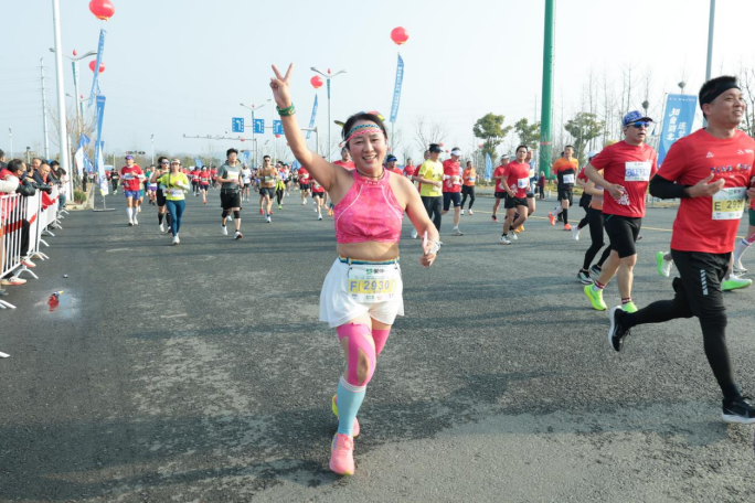 赛道旁,12名锣鼓队员精神抖擞,鼓槌起落间,鼓点时而急促如奔雷,激荡冲刺豪情;时而雄浑似战歌,传递坚韧力量。彩绸翻飞、鼓声震天,不少略显疲惫的选手闻声抬头,纷纷挥手致意、提速前行。