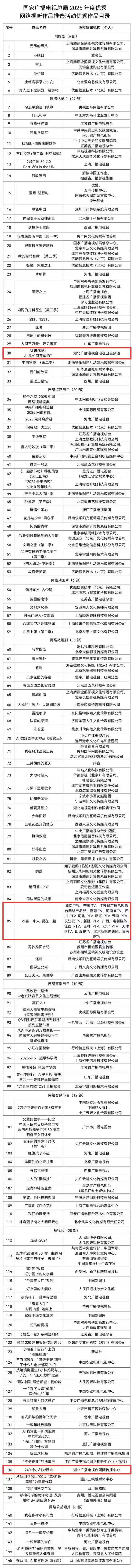 湖北广播电视台3部作品成功上榜,分别为《AI进化论:AI如何开车的》《欢喜一家人・爱在一起》《240个小时游湖北》,作品覆盖网络纪录片、网络微短剧、短视频三大类型,充分展现湖北台在网络视听内容创新与融合传播上的实力。
