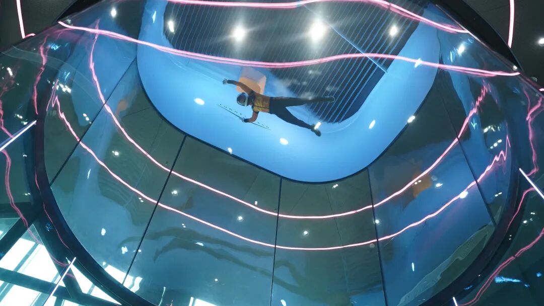 走进世界冠军们训练的风洞训练馆,巨大的透明玻璃圆柱体直通穹顶,底部强劲的鼓风系统发出轰鸣。探访员不仅站进风洞,零距离感受“飞翔”的奥秘,还随着教练在滑板上模拟空中动作。