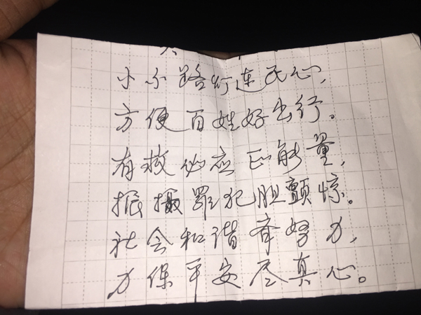 杨大爷拉着彭枫的手:“以前都是打电话,来,在灯下仔细看看你。”说完,又从口袋里拿出一张小纸条,念起了自己写的小诗:“小小路灯连民心,方便百姓好出行,有救必应正能量,振摄罪犯胆颤惊,社会和谐齐努力,力保平安尽真心。”