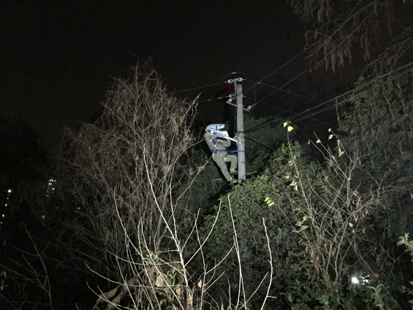 6点21分,彭枫和搭档了十几年的曾庆胜穿好防护服,绝缘鞋,整理好安全设备、梯子、灯泡及线缆,开上小黄车,拉亮警报灯,出发了。
