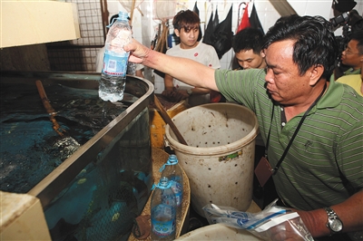 武汉市食药监执法大队执法人员正在观察鱼鳍的根部和鱼身掉鳞的位置。